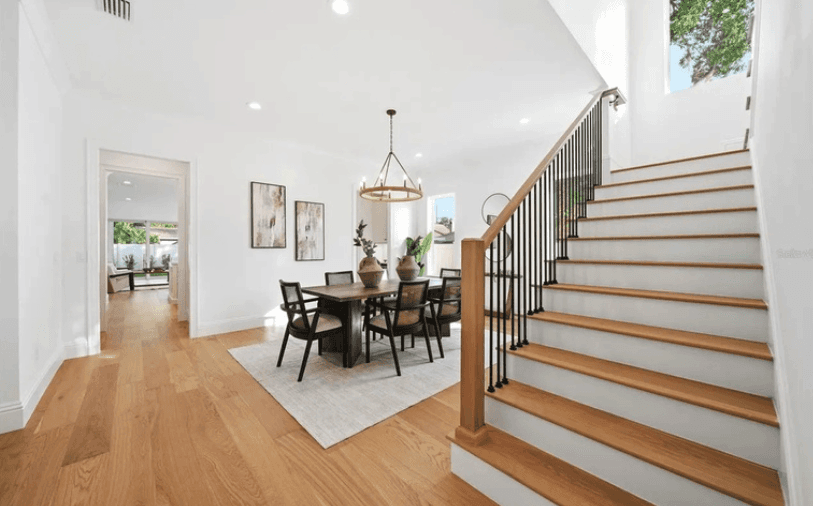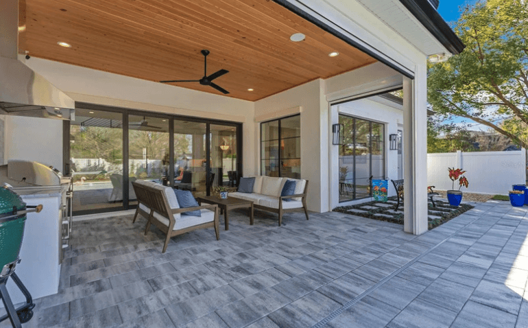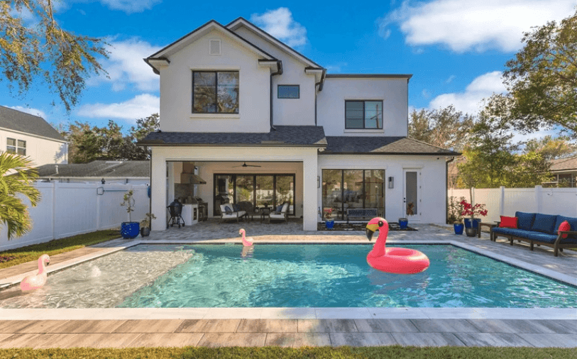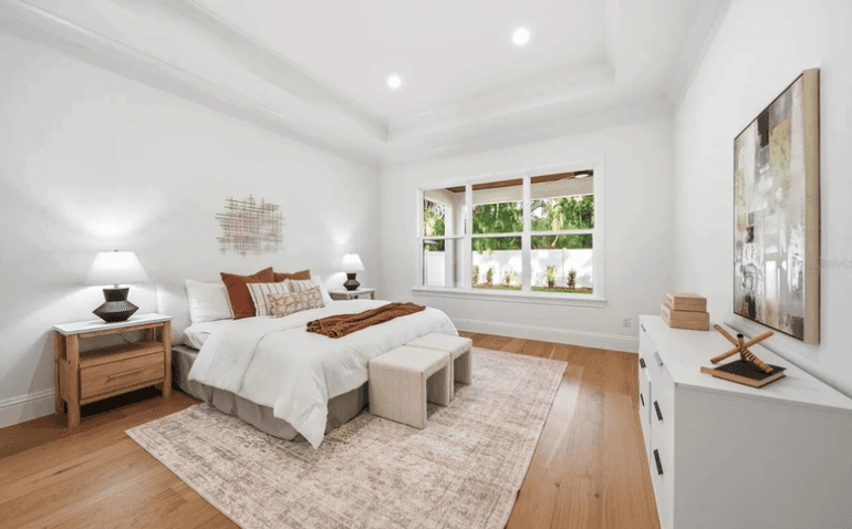 A clean, modern home with white stucco walls, white garage door, and white window trim, creating a bright and minimalist look. The black front door and black light fixtures add contrast and a contemporary touch, resulting in a simple, elegant, and timeless façade.