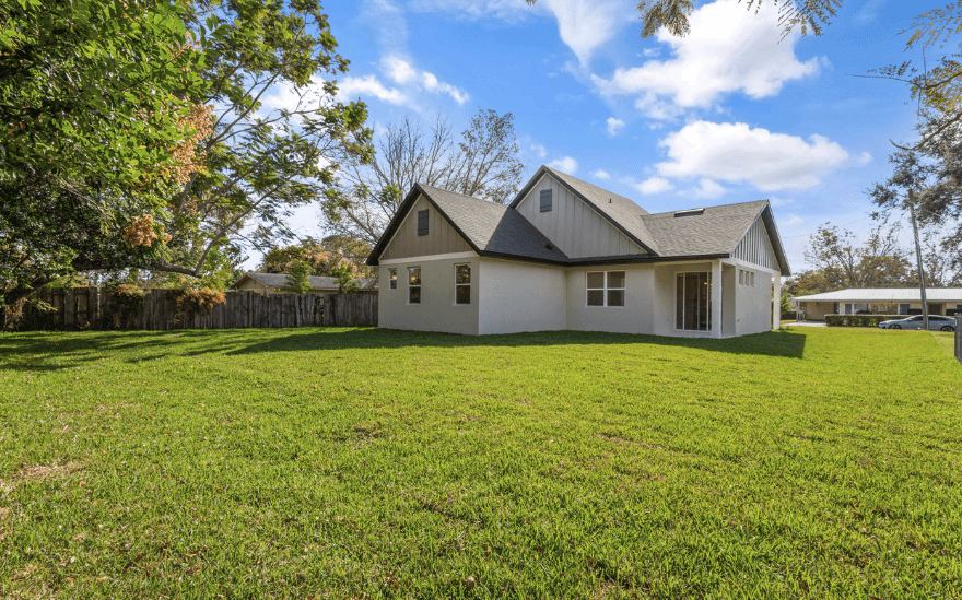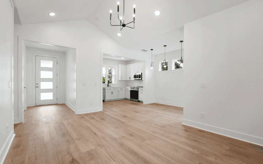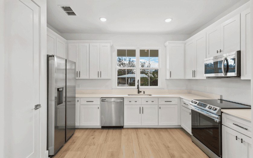 A clean, modern home with white stucco walls, white garage door, and white window trim, creating a bright and minimalist look. The black front door and black light fixtures add contrast and a contemporary touch, resulting in a simple, elegant, and timeless façade.